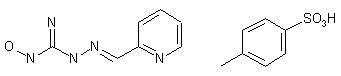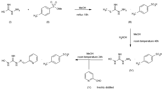 A slightly modified method of Houlihan et al. is used in making the intermediate 1-amino-3-hydroxyguanidine tosylate. Thiosemicarbazide (I) (0.5 mol) and methyl p-toluenesulfonate (II) (0.5 mol) are refluxed with stirring for 18 h. The reaction mixture is then evaporated to about 250 ml in vacua, and 500 ml of ether is added. The white precipitate formed is filtered and washed with ether. The resultant S-methylisothiosemicarbazide tosylate (III) (135g) gives a melting point of 144-6 C. Cold methanolic KOH solution (0.5 mol in 250 mI) is added to a cold hydroxyamine hydrochloride solution 10.5 mol). The mixture is stirred for 1 h in a salt-ice bath. The KCl precipitate formed is removed by filtration. S-Methyl-isothiosemicarbazide tosylate (III) (0.4 mol) is added to the filtrate. The reaction mixture is stirred at room temperature for 48 h, then evaporated to dryness in vacua at 40 C. The residue is dissolved in hot ethanol (800 mI) and cooled to room temperature. A small amount of insoluble precipitate is filtered off, then the filtrate is concentrated to about 200 ml in vacuo. Ether (400 ml) is added and mixed thoroughly to precipitate out the desired intermediate. This is filtered and washed with a mixture of ether and ethanol (2:1). White crystalline product of 1-amino-3-hydroxyguanidine tosylate (IV) (50 g) is obtained with an m.p. of 136-7 C, and it decomposes at 150-5 C. To prepare title compound 0.04 mol of freshly distilled 2-formylpyridine (V) is added dropwise to a solution of 0.04 mol of 1-amino-3-hydroxyguanidine tosylate (IV) in 25 ml methanol. The reaction mixture is stirred overnight at room temperature. The solvent is evaporated in vacuo. The final resultant Schiff's base is recrystallized with a mixture of ethanol-ether (1:1). The yield of the final product is 6.48 g (46.1%).
