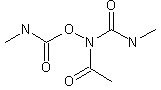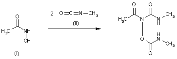 Acetohydroxamic acid (I) is reacted with two moles of methyl isocyanate (II).