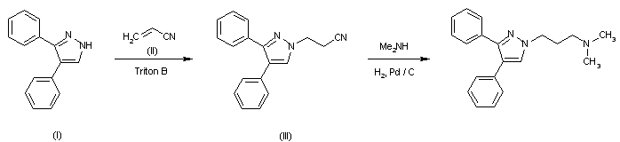 1) The condensation of 3,4-diphenylpyrazole (I) with acrylonitrile (II) by means of benzyl-trimethyl-ammonium hydroxide (Triton B) in dioxane gives 1-(2-cyanoethyl)-3,4-diphenylpyrazole (III), which is then reductocondensed with dimethylamine by means of H2 over Pd/C in ethanol.