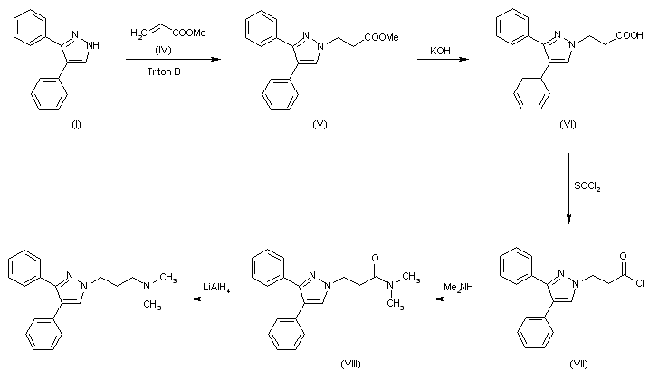 2) The condensation of (I) with methyl acrylate (IV) by means of Triton B as before gives methyl 3-(3,4-diphenylpyrazol-1-yl)propionate (V), which is saponified with KOH in refluxing methanol yielding the corresponding free acid (VI). The reaction of (VI) with SOCl2 in refluxing CHCl3 affords the acyl chloride (VII), which is treated with dimethylamine in THF to give N,N-dimethyl-3-(3,4-diphenylpyrazol-1-yl)propionamide (VIII). Finally, this compound is reduced with LiAlH4 in refluxing THF.
