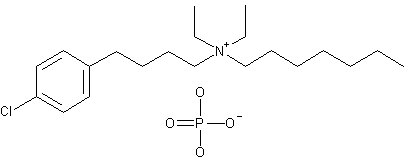 The reaction of p-chlorobenzaldehyde (I) sodium cyanide and ethyl acetate gives ethyl 4-(p-chlorophenyl)-4-oxobutyrate (II), which is hydrolyzed with KOH to the corresponding free acid (III). The reduction of (III) with Zn and aqueous HCl affords 4-(p-chlorophenyl)butyric acid (IV), which is condensed with heptylamine (B) by means of oxalyl chloride (A) in refluxing benzene to yield N-heptyl-4-(p-chlorophenyl)butyramide (V), which is reduced with diborane in refluxing THF to afford N-heptyl-4-(p-chlorophenyl)butylamine (VI). The acetylation of (VI) with acetyl chloride (C) by means of Na2CO3 in acetone gives N-acetyl-N-heptyl-4-(p-chlorophenyl)butylamine (VII), which is reduced with diborane as before to yield N-ethyl-N-heptyl-4-(p-chlorophenyl)butylamine (VIII). The quaternization of (VIII) with refluxing ethyl bromide (D) gives N,N-diethyl-N-heptyl-4-(p-chlorophenyl)butylammonium bromide (IX), which by elution through a column with Dowex 1-X8, hydroxide form, resin is converted into N,N-diethyl-N-heptyl-4-(p-chlorophenyl)butyl ammonium hydroxide (X). Finally, this compound is salified with diluted aqueous phosphoric acid.