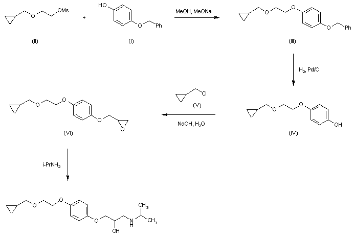 The alkylation of 4-benzyloxyphenol (I) with 2-(cyclopropylmethoxy)ethyl mesylate (II) by means of NaOCH3 in refluxing methanol gives 4-[2-(cyclopropylmethoxy)-1-ethoxy]phenylmethoxybenzene (III), which is debenzylated by hydrogenolysis with H2 over PdC in methanol yielding 4-[2-(cyclopropylmethoxy)-1-ethoxy]phenol (IV). The treatment of (IV) with epichlorohydrin (V) in aqueous NaOH affords 1-[4-[2-(cyclopropylmethoxy)ethoxyphenoxy]-2,3-epoxy]propane (VI). Finally, this compound is treated with an excess of isopropylamine at room temperature to yield cicloprolol.