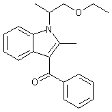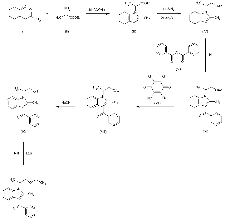 The cyclization of 2-acetonylcyclohexanone (I) with alanine ethyl ester (II) by means of sodium acetate in refluxing acetic acid gives ethyl 2-(4,5,6,7-tetrahydro-2-methylindol-1-yl)propionate (III), which is reduced with LiAlH4 in ether and acetylated with acetic anhydride in pyridine yielding 1-(1-acetoxy-2-propyl)-2-methyl-4,5,6,7-tetrahydroindole (IV). The benzoylation of (IV) with benzoic anhydride (V) and HI at 145 C affords 1-(1-acetoxy-2-propyl)-3-benzoyl-2-methyl-4,5,6,7-tetrahydroindole (VI), which is aromatized by treatment with 2,3-dichloro-5,6-dicyanobenzoquinone (VII) in refluxing dioxane to afford 1-(1-acetoxy-2-propyl)-3-benzoyl-2-methylindole (VIII) The hydrolysis of (VIII) with NaOH in methanol water gives 1-(1-hydroxy-2-propyl)-3-benzoyl-2-methylindole (IX), which is finally alkylated with ethyl bromide by means of NaH in dimethoxyethane.