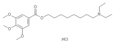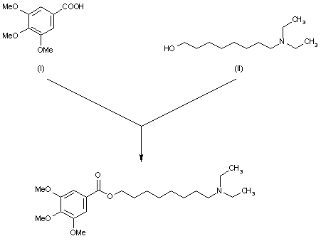 TMBN's have been synthesized by the method of Sastry and Lasslo by dissolving 0.05 moles of 3,4,5-trimethoxybenzoic acid (I) in 300 ml of dry benzene, to which 100 ml benzene containing 0.05 moles n-(N,N-dimethylamino) (CH2)nOH (II) was added dropwise with constant stirring. The temperature was maintained at 29-34 C. The reaction mixture was agitated for 2 additional hours at room temperature, then refluxed for 2 hours on steam bath. The product was recrystallized from benzene or from a mixture of ether and benzene. TMB-8 is considered more difficult to synthesize than TMB-6.