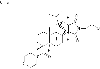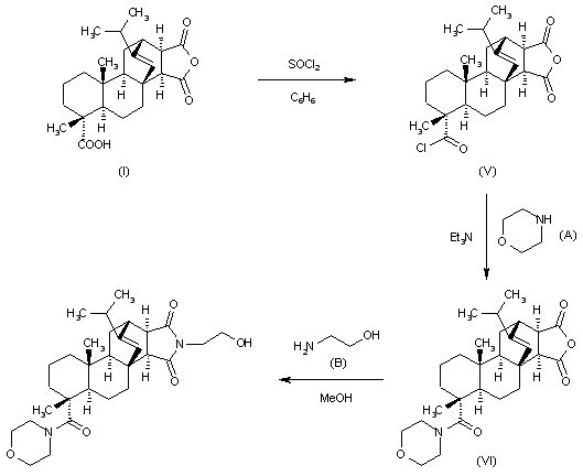 The reaction of maleopimaric acid (I) with SOCl2 in benzene produces the corresponding acyl chloride (V), which is then condensed with morpholine (A) by means of Et3N in benzene yielding maleopimaryl morpholide (VI). Finally, (VI) is condensed with ethanolamine (B) in refluxing ethanol.