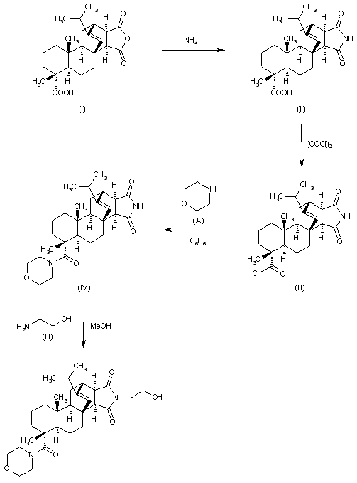 The reaction of maleopimaric acid (I) with aqueous ammonia and heating at 170 C gives maleopimarimide (II), which by reaction with oxalyl chloride in benzene is converted into the corresponding acyl chloride (III). The reaction of (III) with morpholine (A) in benzene yields maleopimarimidyl morpholide (IV), which is finally condensed with ethanolamine (B) in refluxing methanol.