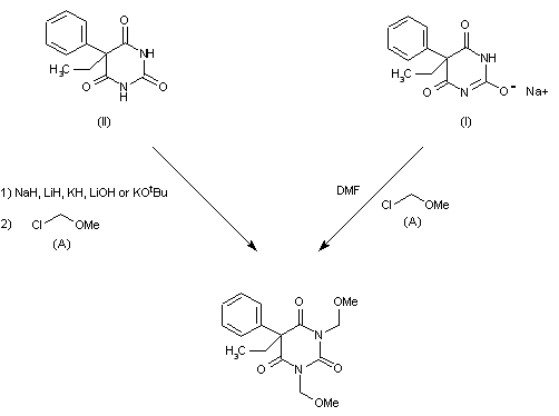 By reaction of sodium phenobarbital (I) with 2 mols of methyl chloromethyl ether (A) in DMF. It can also be obtained by reaction of phenobarbital (II), 2 mols of NaH, LiH, KH, LiOH or t-BuOK and 2 moles of methyl chloromethyl ether (A) in DMF.