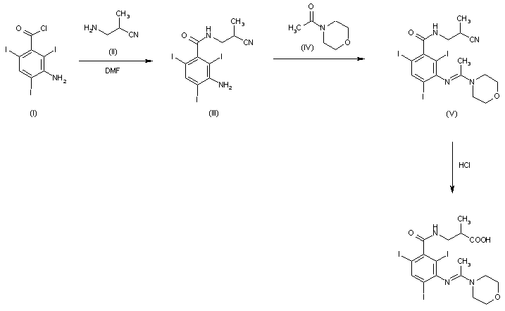 The title compound was prepared by reacting 3-amino-2,4,6-triiodobenzoyl chloride (I) with alpha-methyl-beta-aminopropionitrile (II) in DMF and subsequently by treatment of the intermediary amine (III) with N-acetylmorpholine (IV) to yield the nitrile (V), which was then hydrolyzed with HCl.