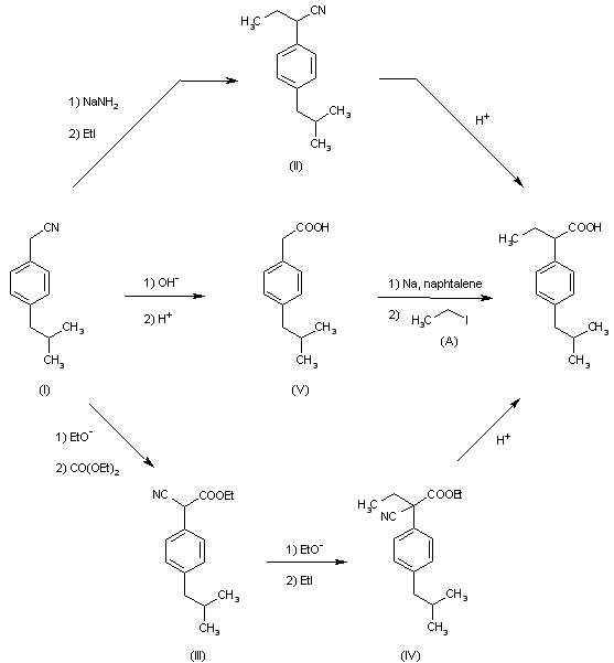 Several methods for obtaining this compoud have been described: 1) By treating the 4-isobutyl phenyl acetonitrile (I) with sodium amide and ethyl iodide, followed by the hydrolysis of the reaction product (II). 2) The reaction of the nitrile (I) with sodium ethoxide and diethyl carbonate leads to the cyanoacetic ester (III), which is treated with ethyl iodide; thus (IV) being obtained, the hydrolysis and decarboxylation of (IV) leads to the final acid. 3) The alkaline hydrolysis of the 4-isobutyl phenyl acetonitrile (I) leads to 4-isobutyl phenyl acetic acid (V). This product after treatment with Na in naphthalene and ethyl iodide (A) yields the required compound.