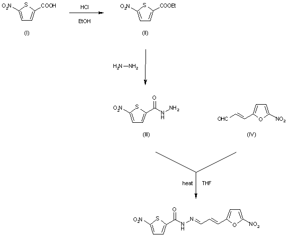 The esterification of 5-nitro-2-thiophenecarboxylic acid (I) with ethanol and dry HCl in the usual way gives the corresponding ethyl ester (II), which by reaction with hydrazine is converted into 5-nitro-2-thenoylhydrazide (III). Finally, this compound is condensed with 5-nitro-2-furylacrolein (IV) in refluxing THF.