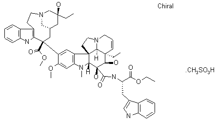 This compound can be obtained by two related ways: 1) The reaction of vinblastine (I) with anhydrous hydrazine in hot ethanol gives 4-deacetylvinblastine-23-acid hydrazide (II), which by reaction with HCl and NaNO2 in cool methanol - water is converted into the corresponding azide (III). Finally, this compound is condensed with L-tryptophan ethyl ester (IV) in dichloromethane. 2) The hydrolysis of vinblastine (I) with NaOH in refluxing ethanol gives 4-deacetylvinblastoic acid (V), which is condensed with L-tryptophan ethyl ester (IV) by means of isobutyl chloroformate (VI) and N-ethylmorpholine in DMF to afford the 4-O-(isobutoxycarbonyl) derivative (VII). Finally, this compound is partially hydrolyzed with KOH in ethanol.