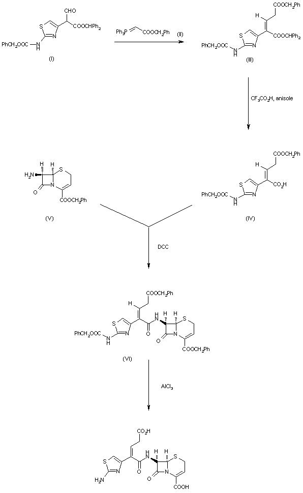 The condensation of 2-[2-(benzoyloxycarbonylamino)thiazol-4-yl]-4-(benzyloxycarbonyl)-2-butenoic acid (I) with 7beta-amino-3-cephem-4-carboxylic acid diphenylmethyl ester (II) by means of mesyl chloride, phosphorus oxychloride or thionyl chloride in basic medium and dichloromethane as solvent gives the protected derivative of the desired product (III), which is then treated with AlCl3 and anisole and acidified with diluted HCl.