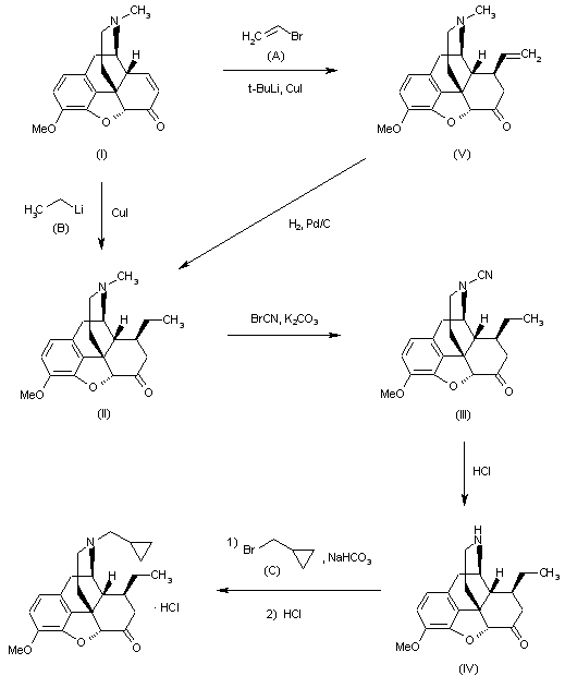 This compound can be obtained in two related ways: 1) The reaction of codeinon (I) with ethyllithium and CuI in ether gives 4,5alpha-epoxy-8beta-ethyl-3-methoxy-17-methylmorphinan-6-one (II), which by treatment with cyanogen bromide and K2CO3 in CHCl3 is converted into 17-cyano-4,5alpha-epoxy-8beta-ethyl-3-methoxymorphinan-6-one (III). Elimination of the cyano group of (III) by treatment with refluxing aqueous 2N HCl yields 4,5alpha-epoxy-8beta-ethyl-3-methoxymorphinan-6-one (IV), which is finally alkylated with cyclopropylmethyl bromide (C) and NaHCO3 in DMF at 100 C. 2) The reaction of codeinon (I) with vinyl bromide (A), tert-butyllithium and CuI in ether gives 4,5alpha-epoxy-3-methoxy-17-methyl-8beta-vinylmorphinanone (V), which is reduced with H2, Pd/C in ethanol to yield (II).