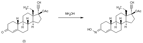 By heating a solution of 13beta-ethyl-17alpha-ethynyl-17beta-acetoxy-gon-4-en-3-one (I) and hydroxylamine hydrochloride in pyridine at 100 C.