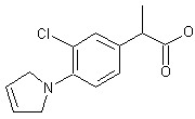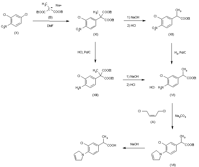 The methylation of ethyl 4-nitrophenylacetate (I) with NaH - ICH3 in DMF - toluene to ethyl 2-(4-nitrophenyl)propionate (II), which was reduced with H2 over Pd/C in EtOH - H2O to ethyl 2-(4-aminophenyl)propionate (III) (HCl deriv., m.p. 137-40 C). This product was acetylated with acetic anhydride to ethyl 2-(acetylaminophenyl) propionate (IV), m.p. 88-90 C, which was chlorinated with Cl2 in acetic acid to ethyl 2-(3-chloro-4-acetylaminophenyl)propionate (V), b.p. 155-60 C/0.7 mm; this, in turn, was hydrolyzed with HCl in EtOH to ethyl 2-(3-chloro-4-aminophenyl)propionate hydrochloride (VI), m.p. 164-8 C. The last step being the reaction of the preceding intermediate with cis-1,4-dichloro (or dibromo)-2-butene (A) in DMF and Na2CO3 to ethyl 2-(3-chloro-4-(3-pyrrolinyl)phenyl)propionate (VII), b.p. 128-33 C/0.25 mm; followed by hydrolysis with KOH in EtOH - H2O. The acetylation of ethyl 4-aminophenylacetate (VIII) with acetic anhydride to ethyl 4-acetylaminophenylacetate (IX), m.p. 75-8 C, followed by methylation with ICH3 and Na in liquid NH3 to ethyl 2-(4-acetylaminophenyl)propionate (IV), already obtained.