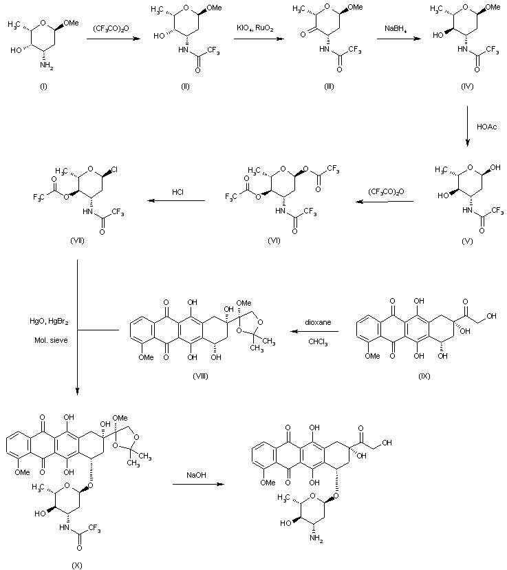 A suspension of methyl 2,3,6-trideoxy-3-amino-alpha-L-lyxo-hexopyranoside (I) is acylated with trifluoroacetic anhydride in ether yielding methyl 2,3,6-trideoxy-3-trifluoroacetamido-alpha-L-lyxo-hexopyranoside (II), which is oxidized with potassium periodate and ruthenium dioxide in CH2Cl2 water to afford methyl 2,3,6-trideoxy-3-trifluoroacetamido-alpha-L-threo-hexapyranosid-4-ulose (III). The reduction of (III) with NaBH4 in dioxane-water gives methyl 2,3,6-trideoxy-3-trifluoroacetamido-alpha-L-arabino-hexopyranoside (IV), which is demethylated by treatment with aqueous acetic acid to yield 2,3,6-trideoxy-4-trifluoroacetamido-alpha-L-arabino-hexopyranose (V). Acylation of (V) with trifluoroacetic anhydride in ether affords 2,3,6-trideoxy-3-trifluoroacetamido-1,4-di-O-trifluoroacetyl-alpha-L-arabino-hexopyranose (VI), which by treatment with dry HCl in ether is converted into 2,3,6-trideoxy-3-trifluoroacetamido-4-O-trifluoroacetyl-alpha-L-arabino-hexopyranosyl chloride (VII). The condensation of (VII) with 9-deacetyl-9-(2',2'-dimethyl-4'-methoxydioxolan-4'-yl)daunomycinone (VIII) [prepared from adriamycinone (IX) and 2,2-dimethoxypropane-p-toluenesulfonic acid in dioxane - CHCl3] by means of HgO and HgBr2 in CH2Cl2 gives 4'-epi-3'-N-trifluoroacetyladriamycin protected in the hydroxylacetyl group (X). Finally, this compound is deprotected by treatment with NaOH in acetone water.