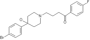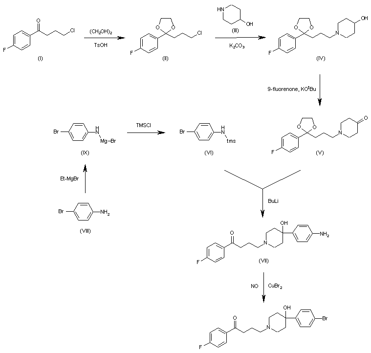 The reaction of 4-chloro-1-(4-fluorophenyl)-1-butanone (I) with ethylene glycol and p-toluenesulfonic acid in refluxing benzene gives the corresponding ethyleneketal (II), which is condensed with 4-hydroxypiperidine (III) by means of K2CO3 in hot DMF yielding 1-(4-fluorophenyl)-4-(4-hydroxypiperidin-1-yl)-1-butanone ethyleneketal (IV). The Oppenauer oxidation of (IV) with 9-fluorenone and potassium tert-butoxide in hot benzene affords the piperidinone (V), which is condensed with 4-bromo-N-(trimethylsilyl)aniline (VI) by means of BuLi in hot hexane to give 4-[4-(4-aminophenyl)-4-hydroxypiperidin-1-yl]-1-(4-fluorophenyl)-1-butanone (VII). Finally, this compound is treated with CuBr2 and NO in THF.