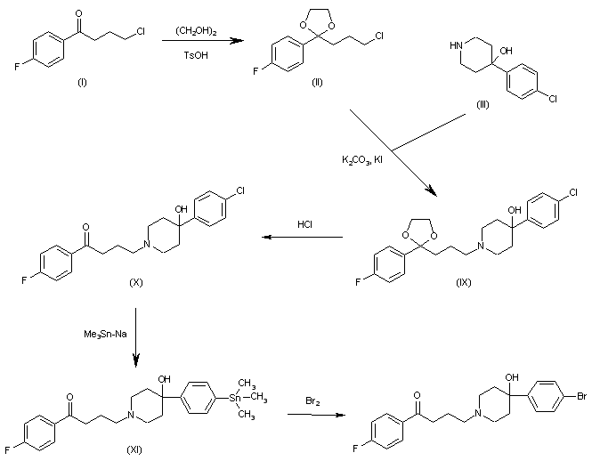 The reaction of 4-chloro-1-(4-fluorophenyl)-1-butanone (I) with ethylene glycol and p-toluenesulfonic acid in refluxing benzene gives the corresponding ethyleneketal (II), which is condensed with 4-(chlorophenyl)-4-hydroxypiperidine (VIII) by means of K2CO3 in hot DMF yielding 4-[4-(4-chlorophenyl)-4-hydroxypiperidin-1-yl]-1-(4-fluorophenyl)-1-butanone ethyleneketal (IX). The reaction of (IX) with HCl in methanol yields the corresponding free butanone (X), which is treated with trimethylstannyl sodium in glyme to afford the expected stannyl derivative (XI). Finally, this compound is treated with Br2 in chloroform.