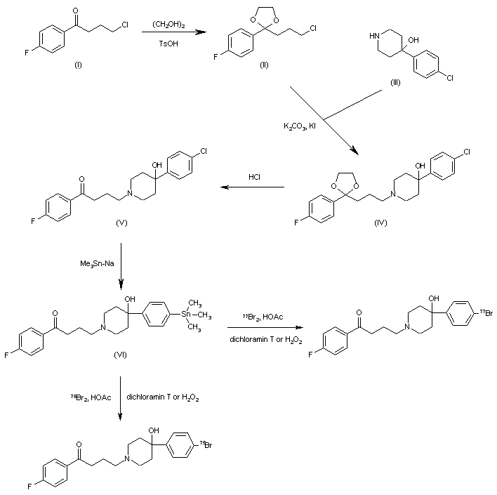 The reaction of 4-chloro-1-(4-fluorophenyl)-1-butanone (I) with ethylene glycol and p-toluenesulfonic acid in refluxing benzene gives the corresponding ethylene-ketal (II), which is condensed with 4-(chlorophenyl)-4-hydroxypiperidine (III) by means of K2CO3 in hot DMF yielding 4-[4-(4-chlorophenyl)-4-hydroxypiperidin-1-yl]-1-(4-fluorophenyl)-1-butanone ethyleneketal (IV). The reaction of (IV) with HCl in methanol yields the corresponding free butanone (V), which is treated with trimethylstannyl sodium in glyme to afford the expected stannyl derivative (VI). Finally, this compound is treated with 75Br2 or 77Br2 and dichloramin T in methanol or H2O2 in acetic acid.