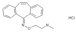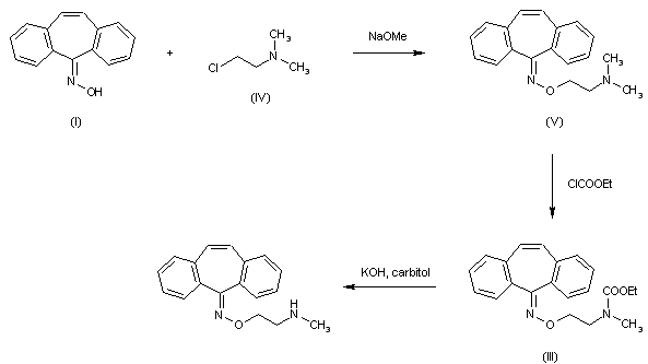 By decomposition of O-beta-(N-methyl-N-carbethoxy)aminoethyl-5H-dibenzo[a,d]cyclohepten-5-one oxime (III) with KOH in carbitol. Compound (III) can be prepared as follows: 5H-ibenzo[a,d]cyclohepten-5-one oxime (I) is treated with beta-dimethylaminoethyl chloride (IV) in sodium methoxide to give O-beta-dimethylaminoethyl-5H-dibenzo[a,d]cyclohepten-5-one oxime (V), which is treated with ethyl chlorocarbonate in anhydrous benzene.