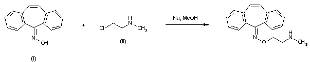 By reaction of 5H-dibenzo[a,d]cyclohepten-5-one oxime (I) with beta-methylaminoethyl chloride (II) in a solution of sodium in methanol.