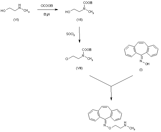 beta-Methylaminoethanol (VI) is treated with ethyl chlorocarbonate in triethylamine to give ethyl N-methyl-hydroxyethylcarbamate (VII), which is treated with thionyl chloride to give ethyl-N-methyl-beta-chloroethylcarbamate (VIII). Compound (VIII) is treated with 5H-dibenzo[a,d]cyclohepten-5-one oxime (I) and the resulting product is decomposed without isolation.