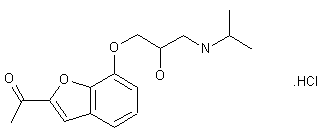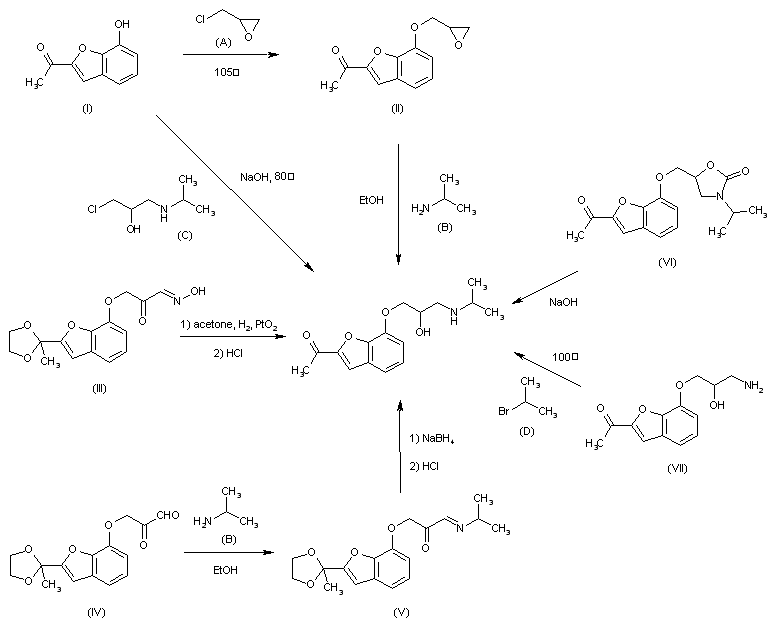 Compound can be prepared in several different ways: 1) The reaction of 2-acetyl-7-hydroxybenzofuran (I) with epichlorohydrin by means of piperidine hydrochloride (A) at 105 C gives 2-acetyl-7-(2,3-epoxypropoxy)benzofuran (II), which is then condensed with isopropylamine (B) in refluxing ethanol. 2) By reaction of (I) with 1-chloro-3-isopropylamino-2-propanol (C) by means of NaOH at 80 C in a sealed tube. 3) By reductocondensation of 2-[1,1-(ethylenedioxy)ethyl]-7-[2-oxo-3-(hydroxyimino)propoxy]benzofuran (III) with acetone by means of H2 and PtO2 in ethanol, followed by hydrolysis of the reduced product with HCl in ethanol. 4) The reaction of 2-[1,1-(ethylenedioxy)ethyl]-7-glyoxylmethoxybenz-furan (IV) with isopropylamine (B) in ethanol gives the corresponding Schiff base (V), which is then reduced with NaBH4 and hydrolyzed with HCl in ethanol. 5) By hydrolysis of 3-isopropyl-5-(2-acetyl-7-benzofuryloxymethyl)oxazolidinone (VI) with aqueous refluxing NaOH. 6) By reaction of 2-acetyl-7-(2-hydroxy-3-aminopropoxy)benzofuran (VII) with isopropyl bromide (D) in ethanol at 100 C.