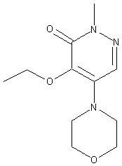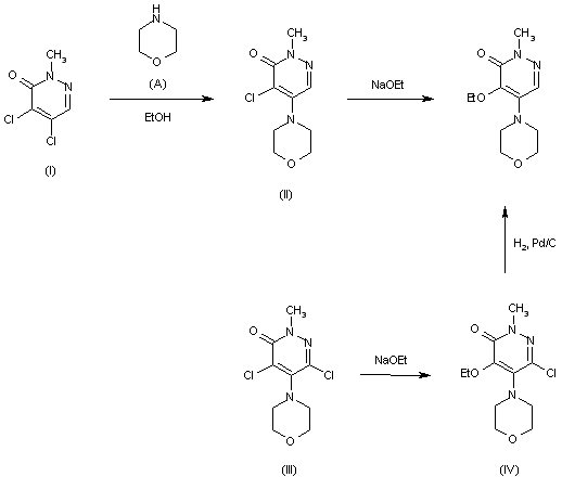 Compound can be prepared in two different ways: 1) The condensation of 4,5-dichloro-2-methyl-3-(2H)pyridazinone (I) with morpholine (A) in refluxing ethanol gives 2-methyl-4-chloro-5-morpholino-3(2H)-pyridazinone (II), which is then treated with sodium ethoxide in refluxing ethanol. 2) The reaction of 2-methyl-4,6-dichloro-5-morpholino-3(2H)pyridazinone (III) with sodium ethoxide in refluxing ethanol gives 2-methyl-4-ethoxy-5-morpholino-6-chloro-3(2H)-pyridazinone (IV), which is then reduced with H2 over Pd/C in THF.