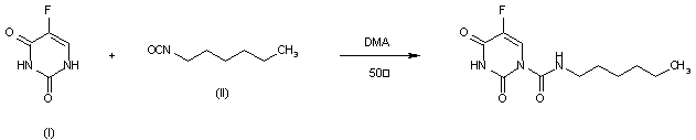 By condensation of 5-fluorouracil (I) with n-hexylisocyanate (II) in dimethylacetamide at 50 C.