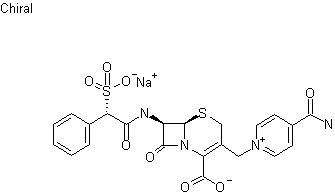 The reaction of 7-aminocephalosporanic acid (I) with alpha-sulfophenylacetyl chloride (II) by means of NaOH and NaHCO3 in ether gives 7-(alpha-sulfophenylacetamido)cephalosporanic acid (III), which is then condensed with isonicotinamide (IV) by means of KSCN and pyridine in water.