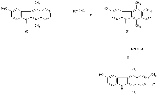 The iodide is formed as follows: 9-Methoxy-ellipticine (I) (extracted from Ochrosia maculata) is demethylated by refluxing with pyridine hydrochloride to give 9-hydroxy-ellipticine (II), which is then treated with methyl iodide in DMF at room temperature.