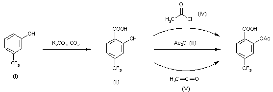 Trifluoromethylphenol (I) is converted into 2-hydroxy-4-trifluoromethylbenzoic acid (II) by treatment with potassium carbonate and carbon dioxide under pressure (Kolbe-Schmitt reaction). (II) is then converted with a suitable acetylating agent in the 2-acetoxy-4-trifluoromethylbenzoic acid (III).
