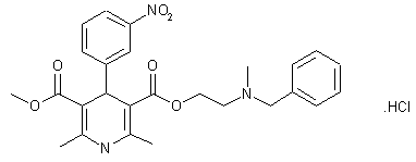 Compound can be prepared in two different ways: 1) By heating at 100 C a mixture of m-nitrobenzaldehyde (I), methyl beta-aminocrotonate (II) and N-benzyl-N-methylaminoethyl acetoacetate (III). 2) By cyclization of a mixture of m-nitrobenzaldehyde (I), methyl acetoacetate (IV) and N-benzyl-N-methylaminoethyl beta + aminocrotonate (V) in refluxing isopropanol.