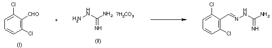 By condensation of 2,6-dichlorobenzaldehyde (I) and aminoguanidine carbonate (II).