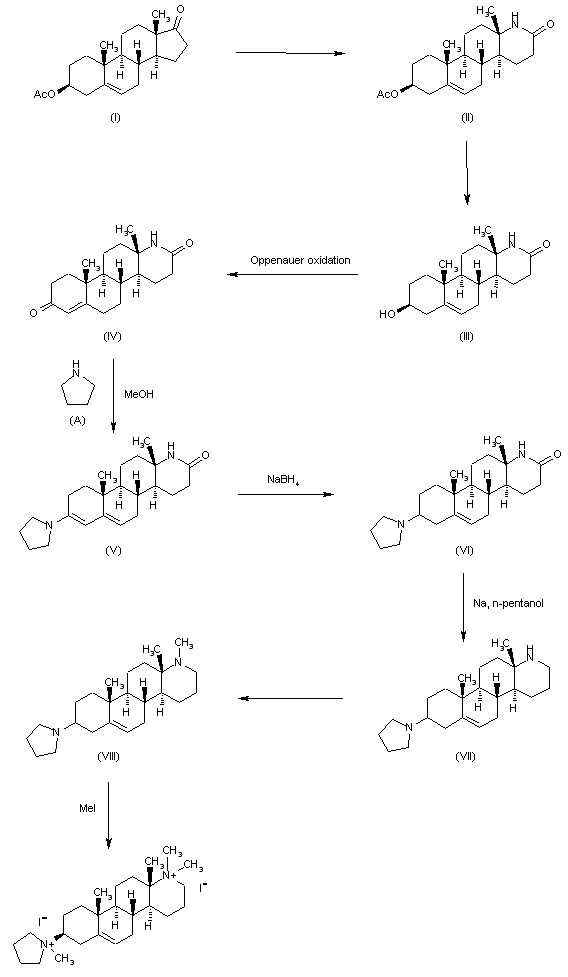 Dehydroepiandrosterone acetate (I) is converted to the lactam (II), which is hydrolyzed to the alcohol (III). Oppenauer oxidation of (III) gives the a,3-unsaturated ketone (IV). The intermediate (IV) is treated with pyrrolidine in methanol to give the enamine (V) in excellent yield. The latter, on sodium borohydride reduction affords (VI), the 3beta- configuration being assigned on the basis of similar reductions reported elsewhere. Sodium and n-pentanol reduction of (VI) leads to the diamine (VII), the methyl derivative (VIII) of which is prepared and converted into the dimethiodide (HS-310).