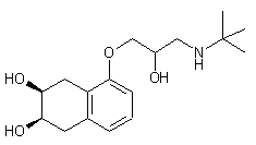 The esterification of 5,8-dihydro-1-naphthol (I) with acetic anhydride gives the corresponding acetate (II), which is oxidized with silver acetate and I2 in acetic acid to yield 2,3-cis-1,2,3,4-tetrahydro-2,3,5-naphthalenetriol (III). The treatment of this product with sodium methylate and epichlorhydrin (A) in methanol gives 2,3-cis-1,2,3,4-tetrahydro-5-(2,3-epoxypropoxy)-2,3-naphthalenediol (IV), which is finally treated with tertbutylamine (B) in chloroform-methanol.