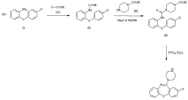 The reaction of O-(p-chlorophenoxy)aniline hydrochloride (I) with ethyl chlorocarbonate (A) in pyridine ether gives ethyl O-(p-chlorophenoxy)phenylcarbanilate (II), which is condensed with N-carbetoxypiperazine (B) by means of Na2O or NaOCH3 in refluxing benzene to afford ethyl 4-[(O-(p-chlorophenoxy)phenyl)carbamoyl]-1-piperazine carboxylate (III). This product is finally decarboxylated and cyclized with P2O5 in refluxing POCl3.