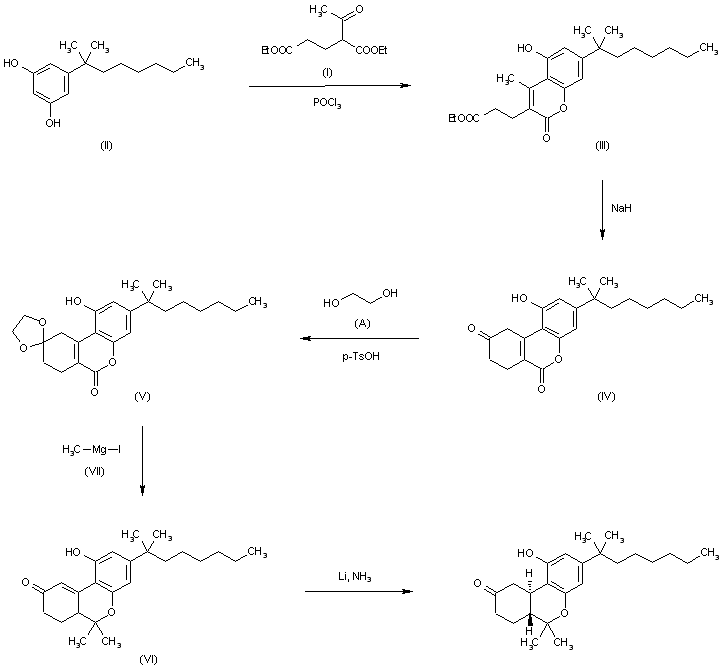 The condensation of diethyl 2-acetylglutarate (I) with 5-(1,1-dimethylheptyl)resorcinol (II) by means of POCl3 gives ethyl 7-(1,1-dimethylheptyl)-5-hydroxy-4-methyl-2-oxo-2H-1-benzopyran-3-propionate (III), which is cyclized by means of NaH in DMSO yielding 3-(1,1-dimethylheptyl)-7,10-dihydro-1-hydroxy-6H-dibenzo[b,d]pyran-6,9-(8H)-dione (IV). The ketalization of (IV) with ethylene glycol (A) and p-toluenesulfonic acid affords the ketal (V), which by a Grignard reaction with methylmagnesium iodide in refluxing ether is converted into dl-3-(1,1-dimethylheptyl)-6,6a,7,8-tetrahydro-1-hydroxy-6,6-dimethyl-9H-dibenzo[b,d]pyran-9-one (VI). Finally, this compound is reduced with Li in liquid ammonia.