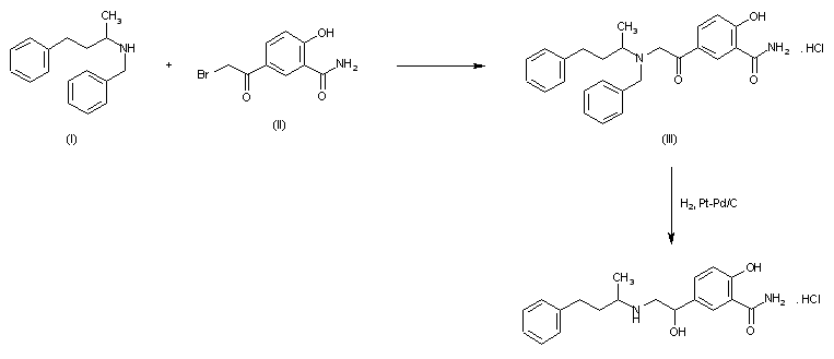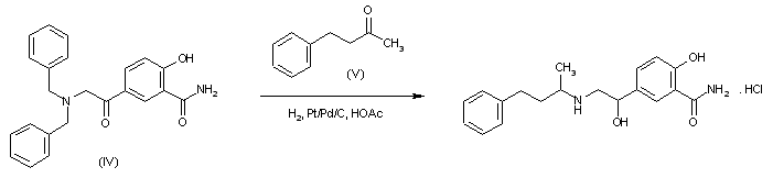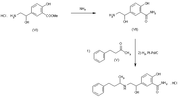Reaction of methyl 5-(2-amino-1-hydroxyethyl)salicylate hydrochloride (VI) with NH3 to 5-(2-amino-1-hydroxyethyl)salicylamide hydrochloride (VII), m.p. >360 C, which is finally condensed with benzylacetone (V) and reduced with H2 over Pd-Pt/C in methanol.