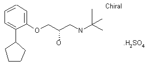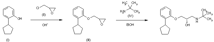 The reaction of 2-cyclopentylphenol (I) with epichlorhydrin (II) in a basic medium yields 1,2-epoxy-3-(2'-cyclopentylphenoxy)propane (III), which is the condensed with tert-butylamine (IV) in hot ethanol.