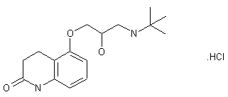 The reaction of cyclohexane-1,3-dione (I) with ammonia gives 3-amino-2-cyclohexen-1-one (II), which is cyclized with acrylic acid (III) by heating at 140 C yielding 1,2,3,4,5,6,7,8-octahydroquinoline-2,5-dione (IV). The dehydrogenation of (IV) by means of Pd/C in refluxing decaline affords 5-hydroxy-1,2,3,4-tetrahydroquinolin-2-one (V), which is condensed with epichlorohydrin (VI) by means of NaOMe or NaOH in methanol giving 5-(2,3-epoxypropoxy)-1,2,3,4-tetrahydroquinolin-2-one (VII). Finally, this compound is treated with tert-butylamine in methanol.