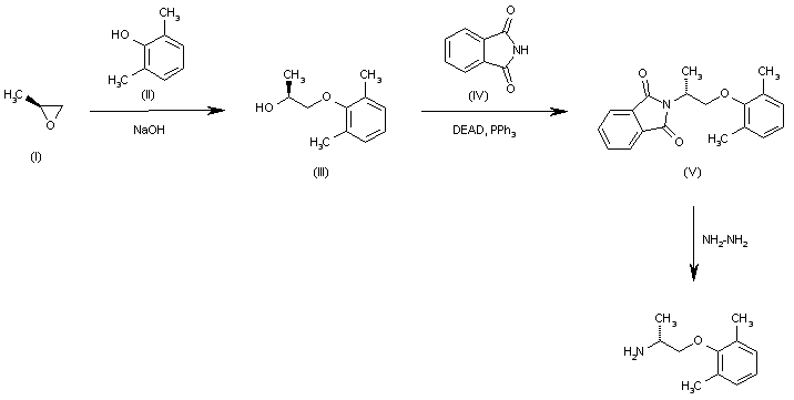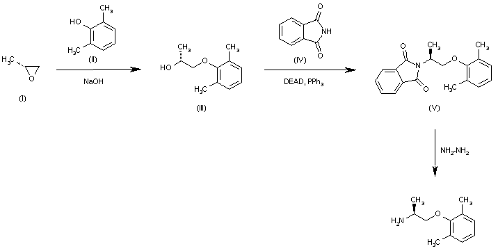 The addition reaction of 2,6-dimethylphenol (II) to (S)-2-methyloxirane (I) by means of NaOH in acetonitrile gives (S)-1-(2,6-dimethylphenoxy)-2-propanol (III), which is condensed with phthalimide (IV) by means of DEAD and PPh3 (with inversion of configuration) yielding N-[2-(2,6-dimethylphenoxy)-1(R)-methylethyl]phthalimide (V). Finally, this compound is treated with hydrazine and acetic acid in methanol to eliminate the phthalimido group.