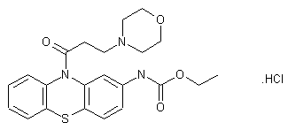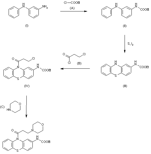 The reaction of 3-aminodiphenylamine (I) with ethyl chloroformate (A) gives ethyl 3-anilinocarbanilate (II), which is cyclized by heating with S and I2 to yield ethyl phenothiazine-2-carbamate (III). The condensation of (III) with 3-chloropropionyl chloride (B) in refluxing toluene affords ethyl 10-(3-chloropropionyl)phenothiazine-2-carbamate (IV), which is finally condensed with refluxing morpholine (C).