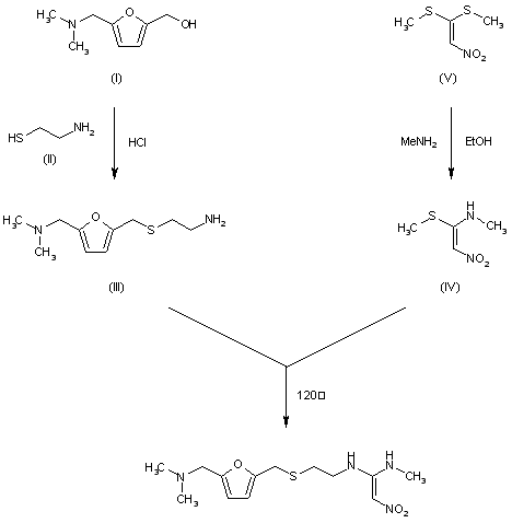The reaction of 5-dimethylaminomethyl-2-furanylmethanol (I) with 2-mercaptoethylamine (II) by means of aqueous HCl gives 2-[[(5-dimethylamino-methyl-2-furanyl)methylthio]ethaneamine (III), which is then condensed with N-methyl-1-methylthio-2-nitrotheneamine (IV) by heating at 120 C. Compound (IV) is obtained by reaction of 1,1-bis(methylthio)-2-nitroethene (V) with methylamine in refluxing ethanol.