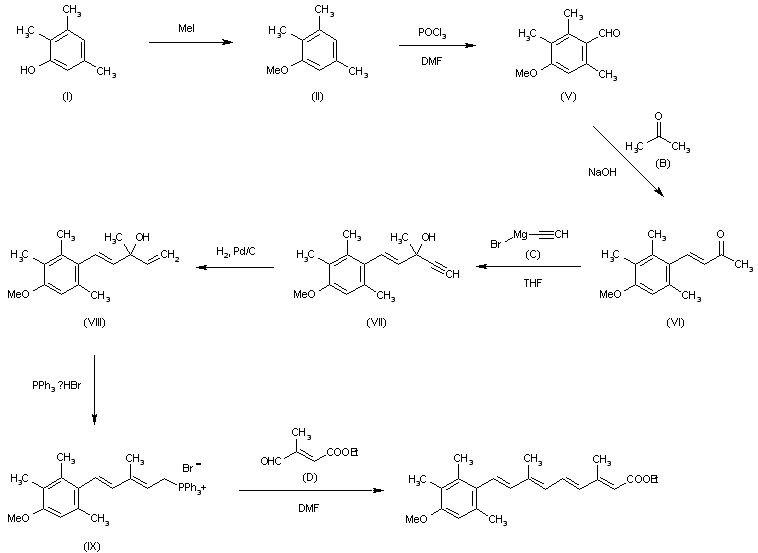 The reaction of 2,3,5-trimethylanisole (II) [prepared by alkylation of 2,3,5-trimethylphenol (I) with methyl iodide] with DMF and POCl3 affords 4-(4-methoxy-2,3,6-trimethylbenzaldehyde (V), which is condensed with propanone (B) in aqueous NaOH giving 4-(4-methoxy-2,3,6-trimethylphenyl)-but-3-en-2-one (VI). The Grignard reaction of (VI) with ethynylmagnesium bromide (C) in THF yields 5-(4-methoxy-2,3,6-trimethylphe-nyl)-3-methyl-3-hydroxypenta-4-en-1-yne (VII), which is partially hydrogenated with H2 over deactivated Pd in hexane to give 5-(4-methoxy-2,3,6-trimethylphenyl)-3-methyl-3-hydroxypenta-1,4-diene (VIII). The reaction of (VIII) with triphenylphosphonium hydrobromide in benzene affords 5-(4-methoxy-2,3,6-trimethylphenyl)-3-methylpenta-2,4-diene-1-triphenylphosphonium bromide (IX). Finally, this compound is submitted to a Wittig reaction with ethyl 3,4-formylcrotonate (D) in DMF (NaH is used as base).